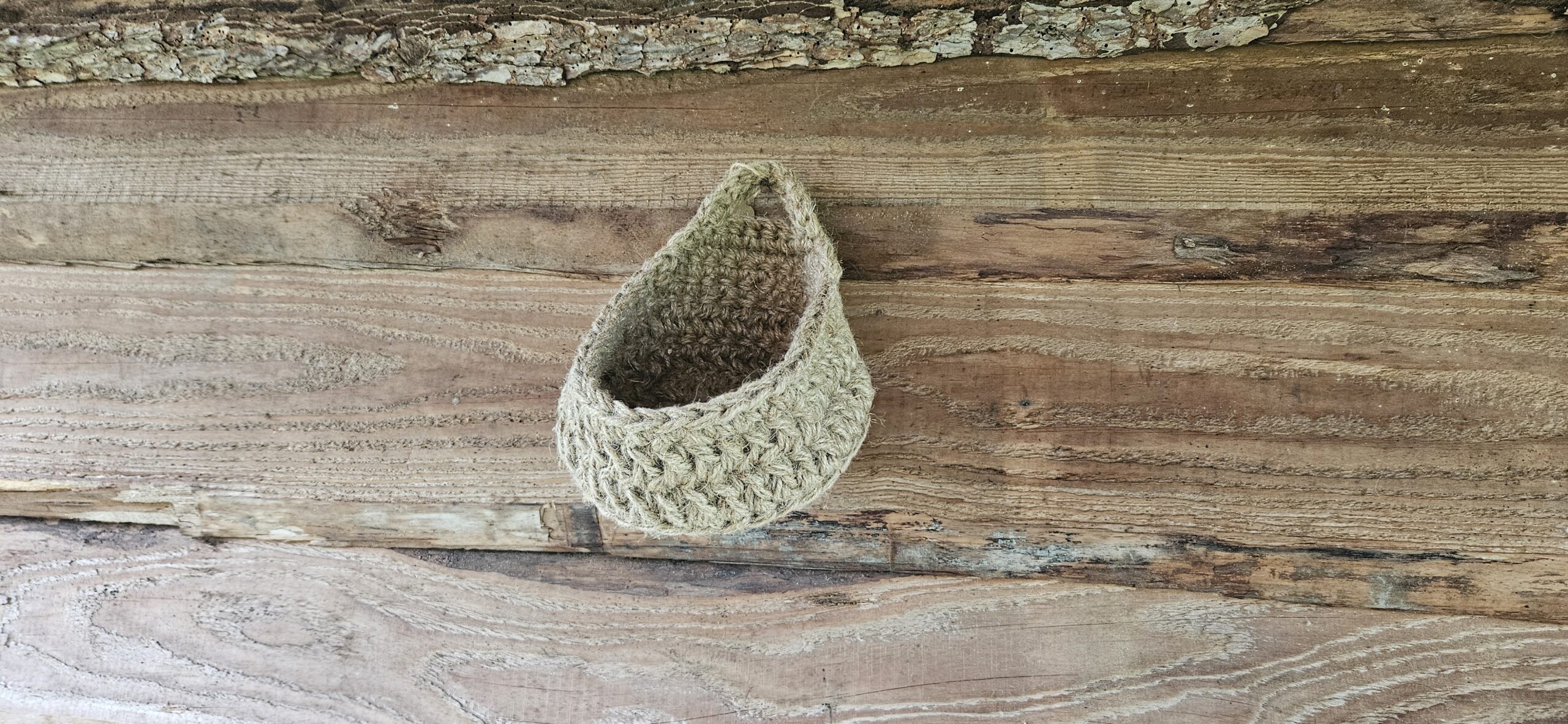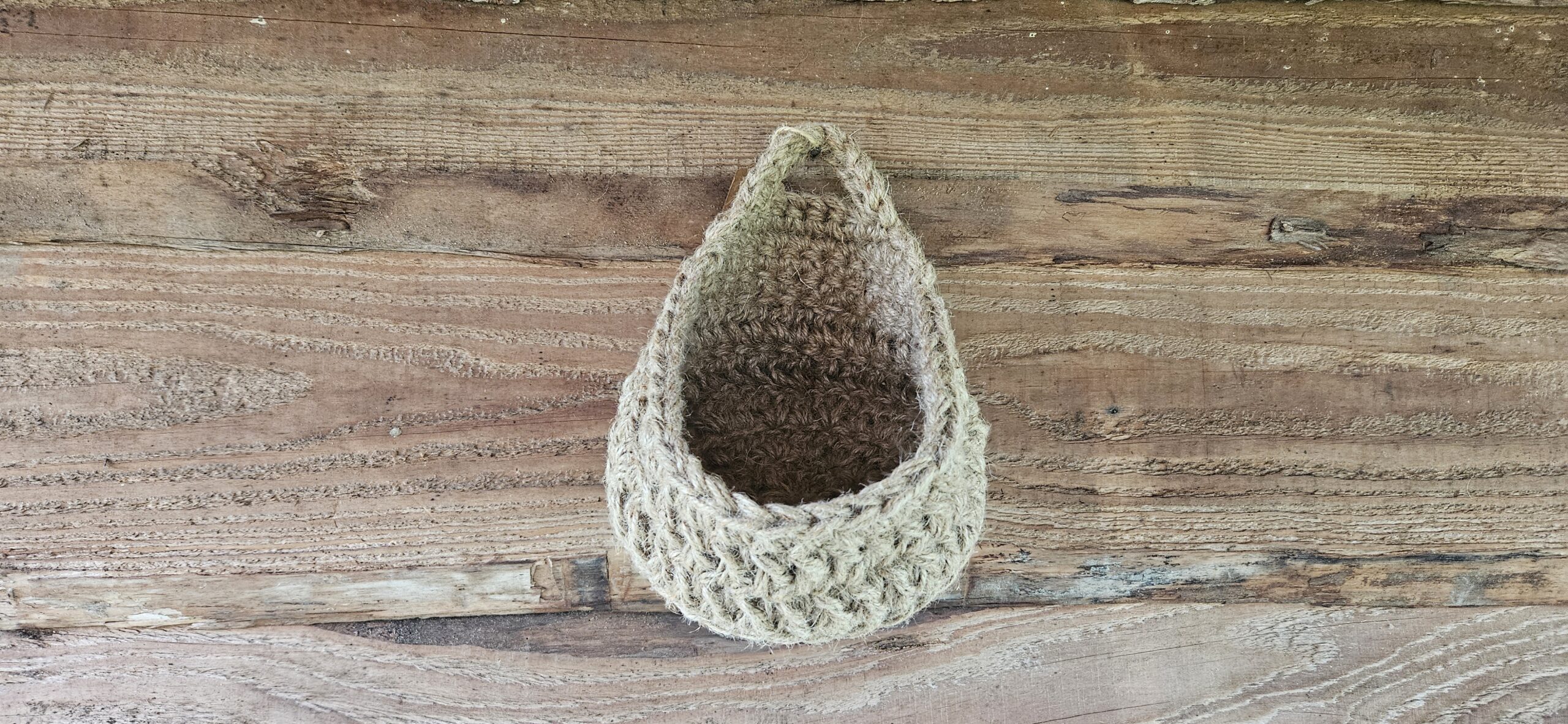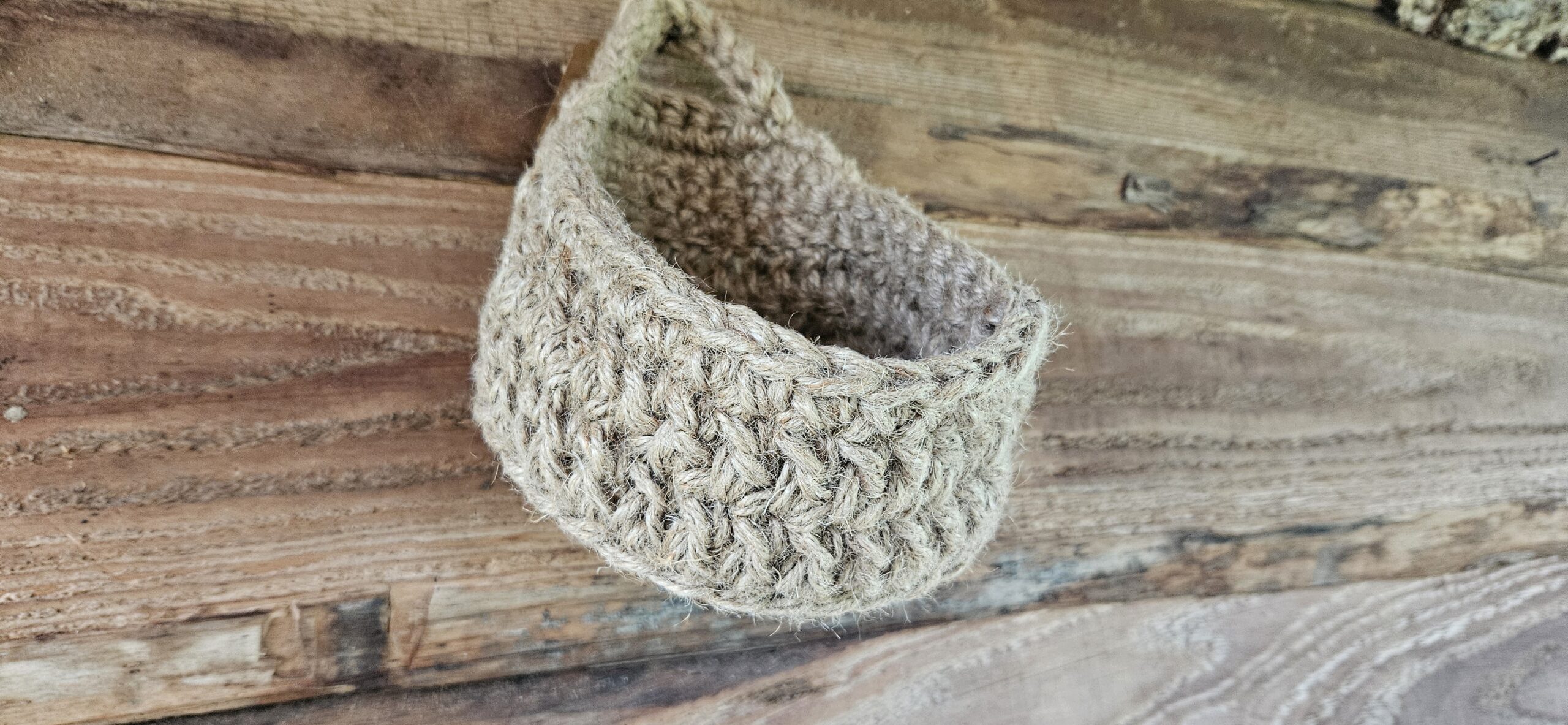 Hangmandje, gehaakt van jute touw. Leuk in de keuken met bijvoorbeeld uien!