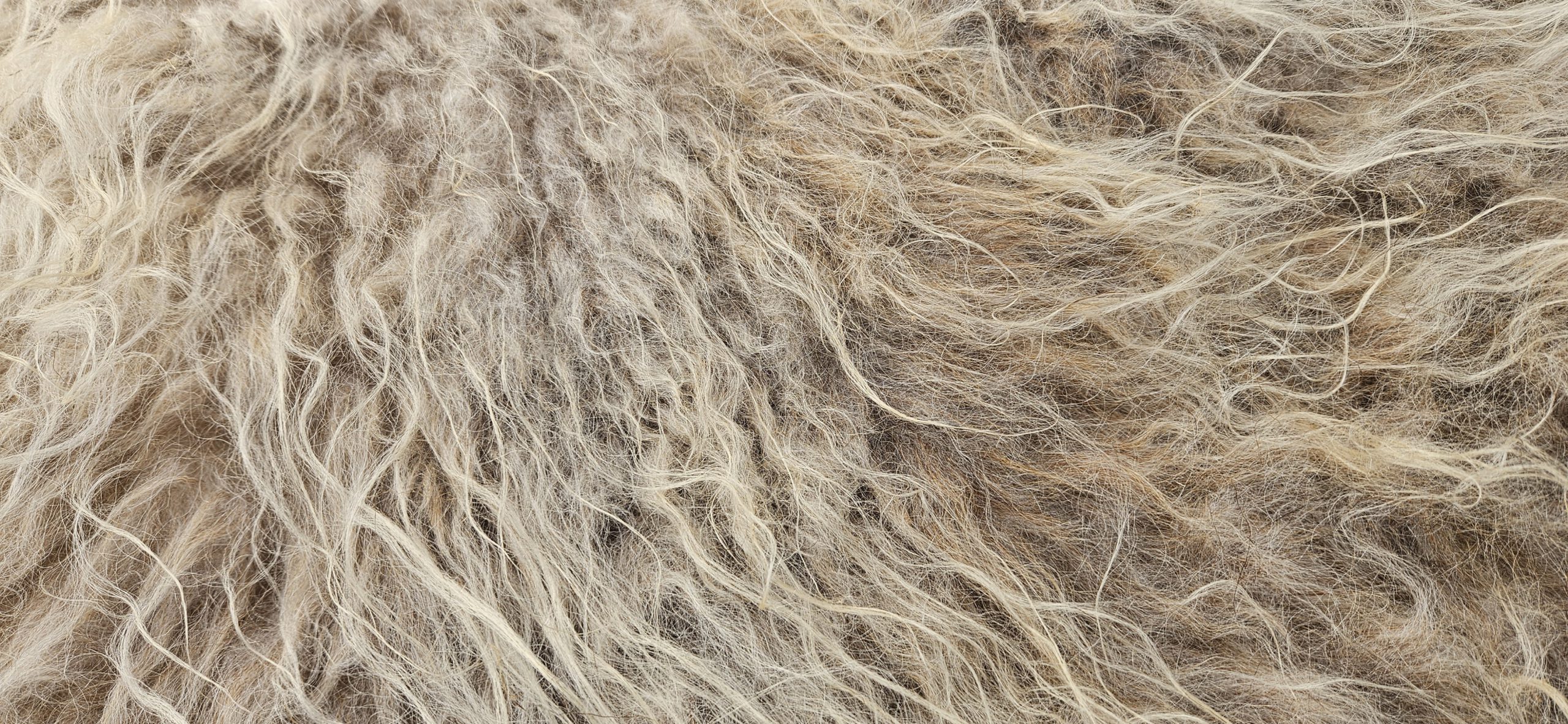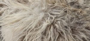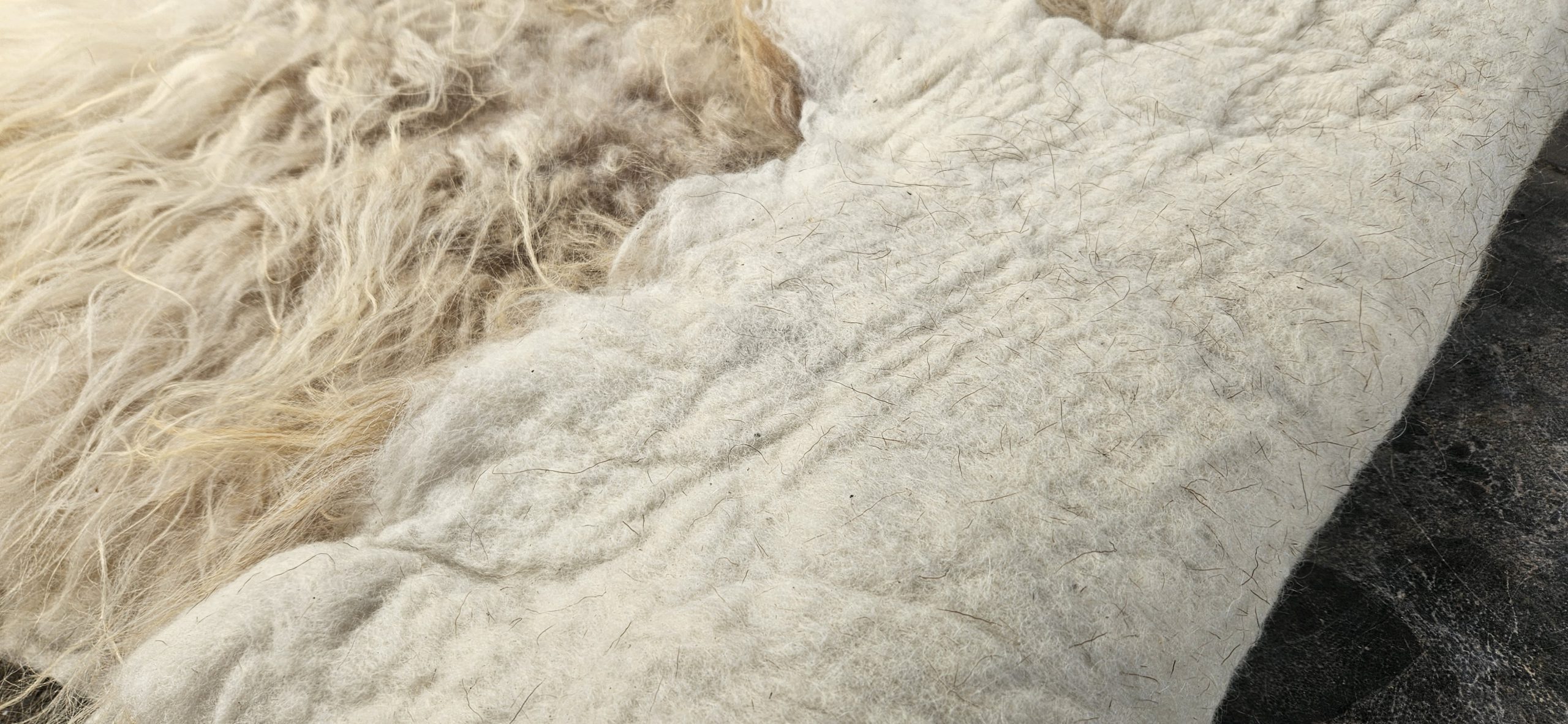 Soepele, lichte vacht van het Drents Heideschaap, voskleur, lichtgrijs en blond. Het is gelukt om de wol van het staartje van het schaap mee te vilten.