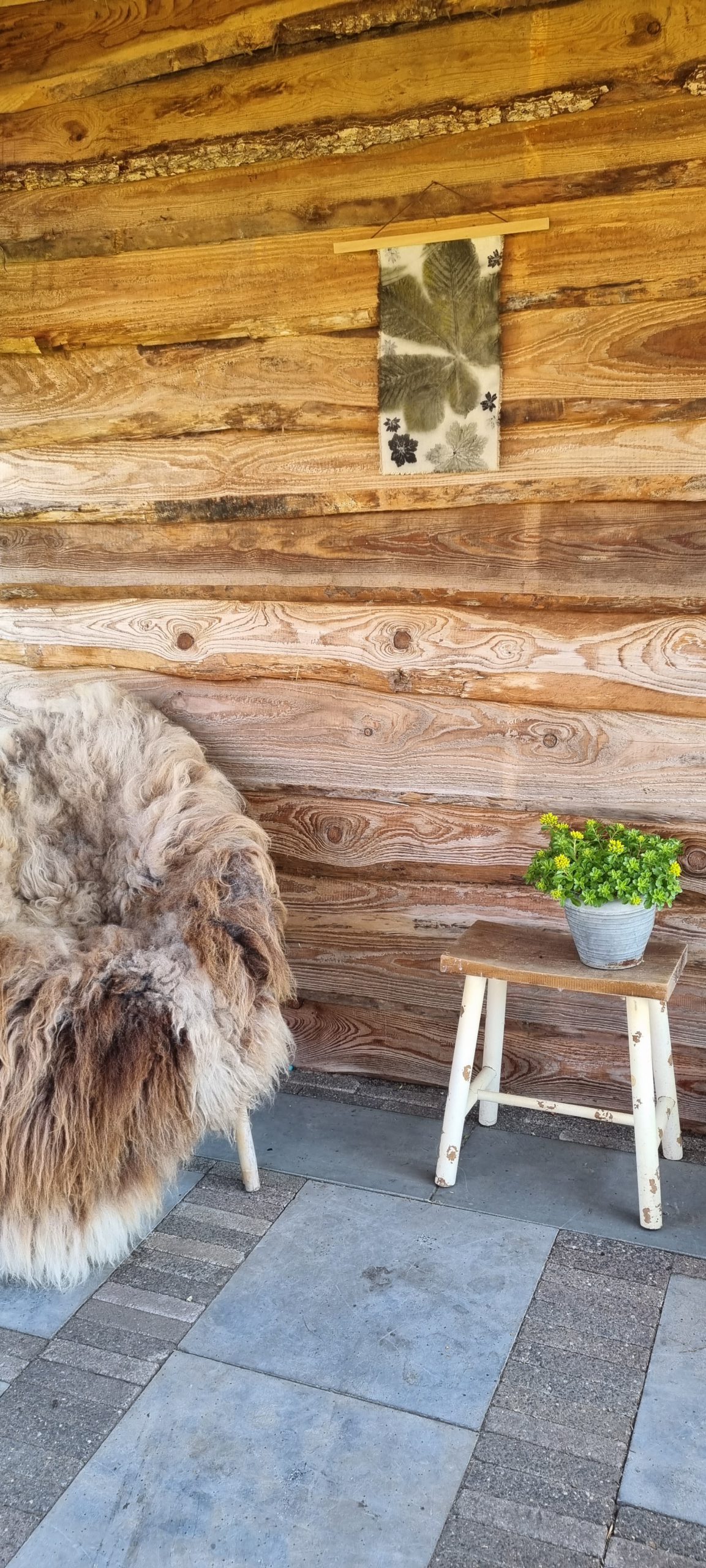 Gemaakt door met bepaalde technieken, natuurlijke hulp- en verfstoffen, de bladstructuren op linnen doek te printen.