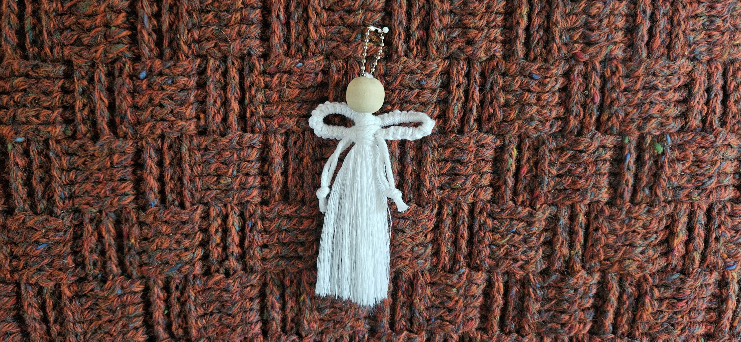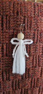 Witte macramé engel, 7 cm breed en 14 cm hoog.