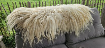 De afmeting van deze vacht is 80 cm x 120 cm, de lange lokken steken nog iets verder uit.