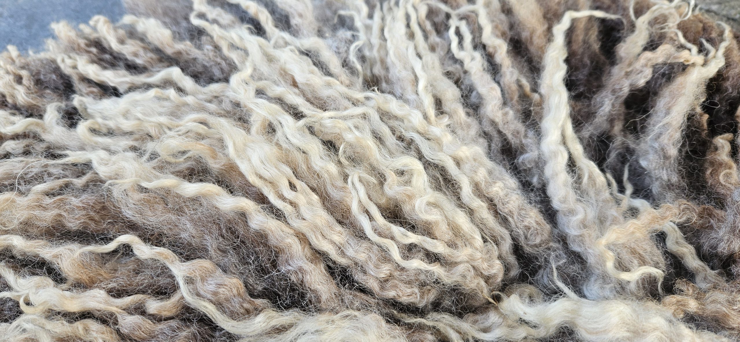 Gevilte vacht van het Wensleydale schaap, prachtige krulletjes in mooie kleuren!