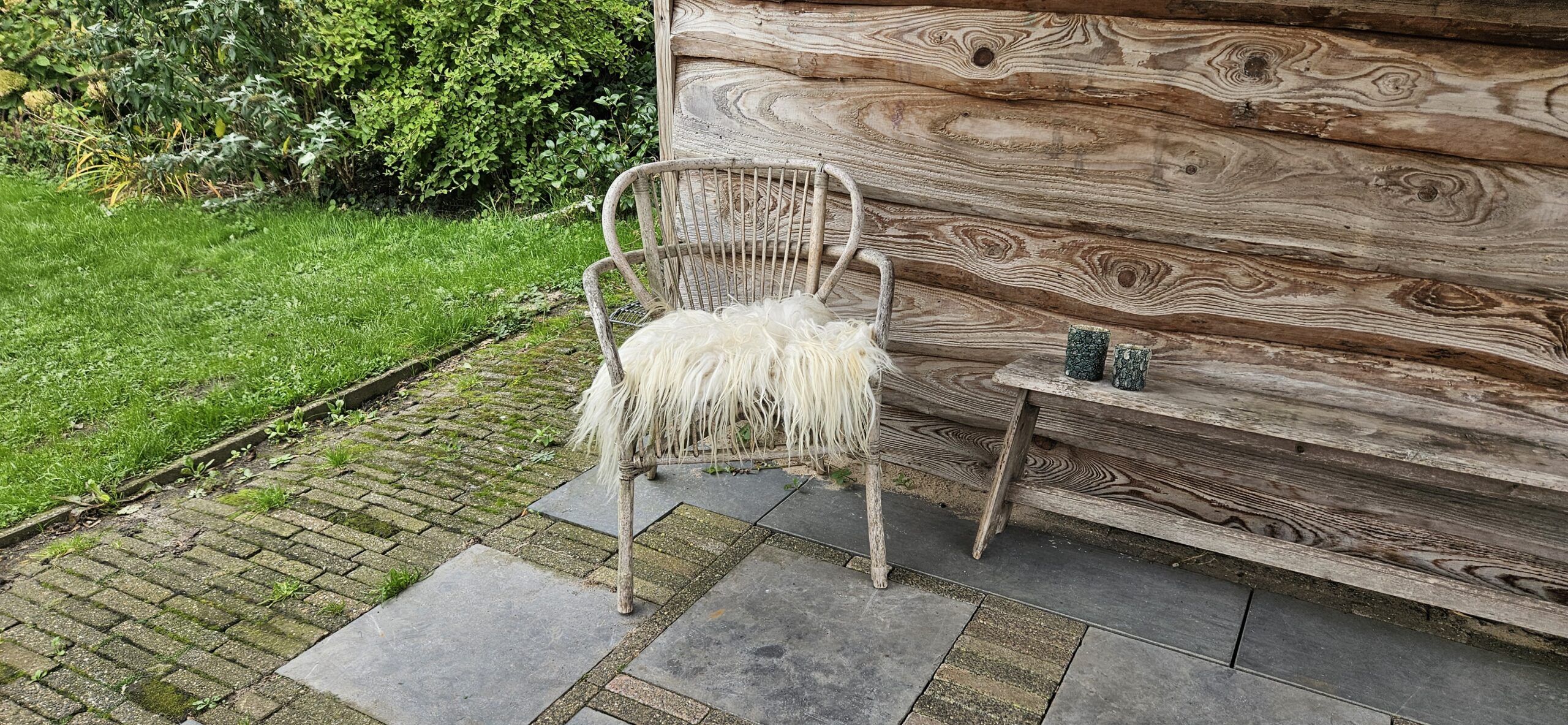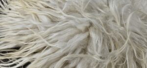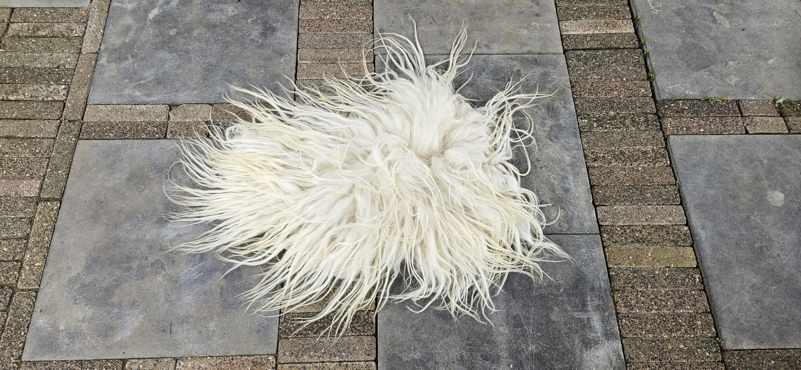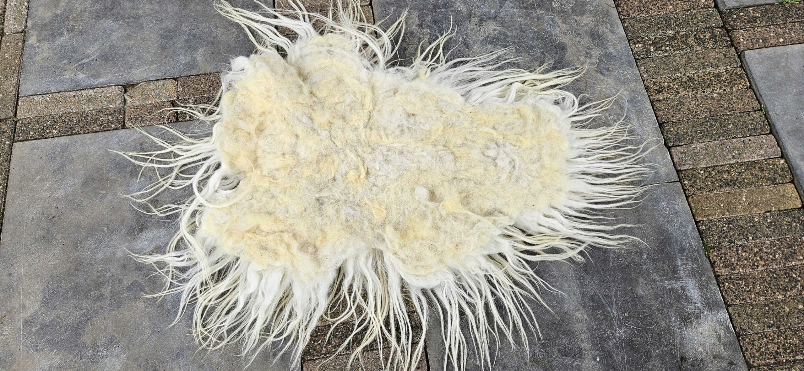 Mooie lange witte lokken van het Drents Heideschaap, vastgevilt op de ruwe wol van het Swifter schaap. Zo ontstaat er weer een stevige, diervriendelijke vacht. Deze schapenvacht is gemaakt van dezelfde afgeschoren vacht van vacht ‘Molly’, eventueel samen een mooie set!