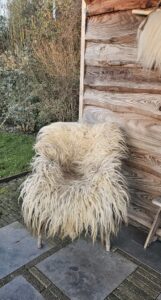 Mooie lichte vacht van het Drents Heideschaap, hoofdzakelijk wit met iets voskleur en lichtgrijs erin. Kortere wol in het midden van de vacht, en lange lokken aan de zijkanten.