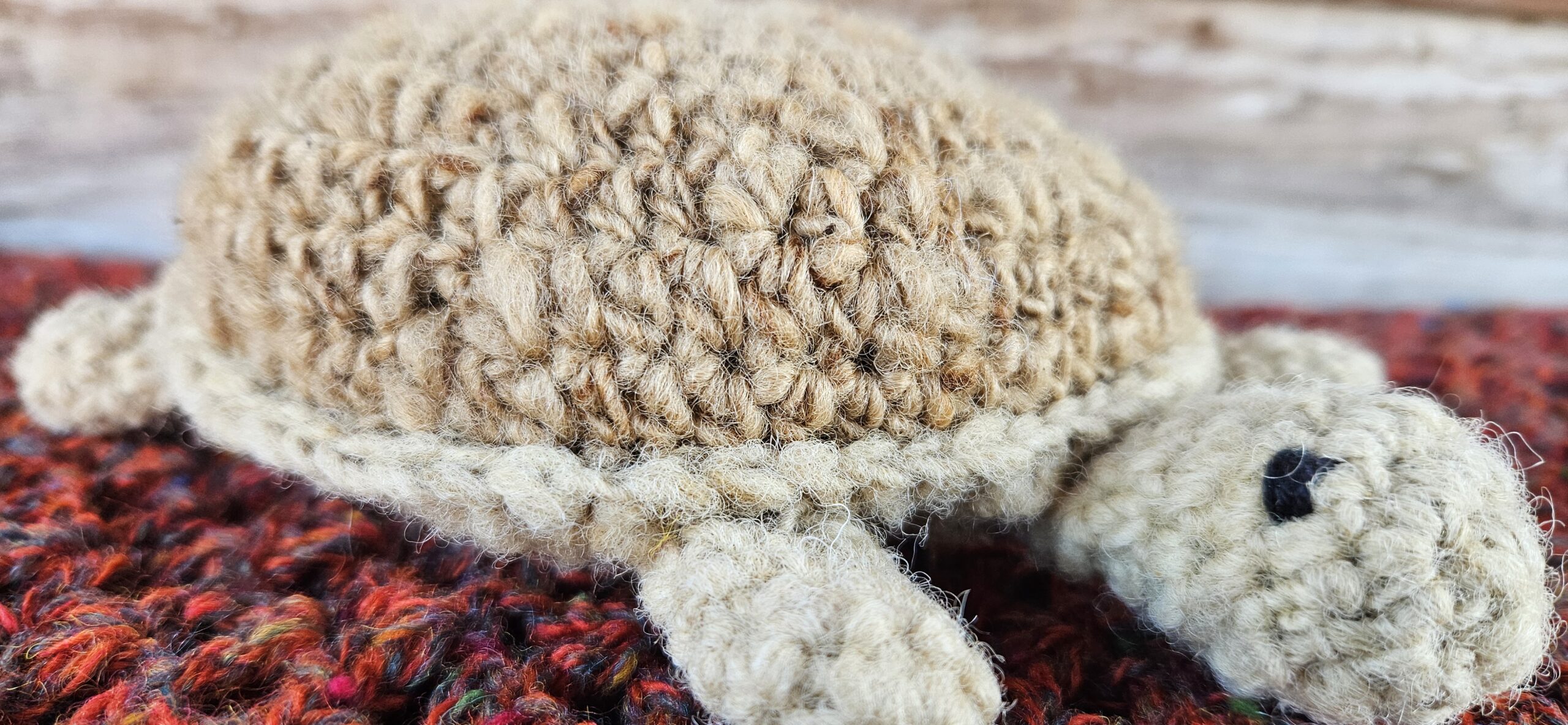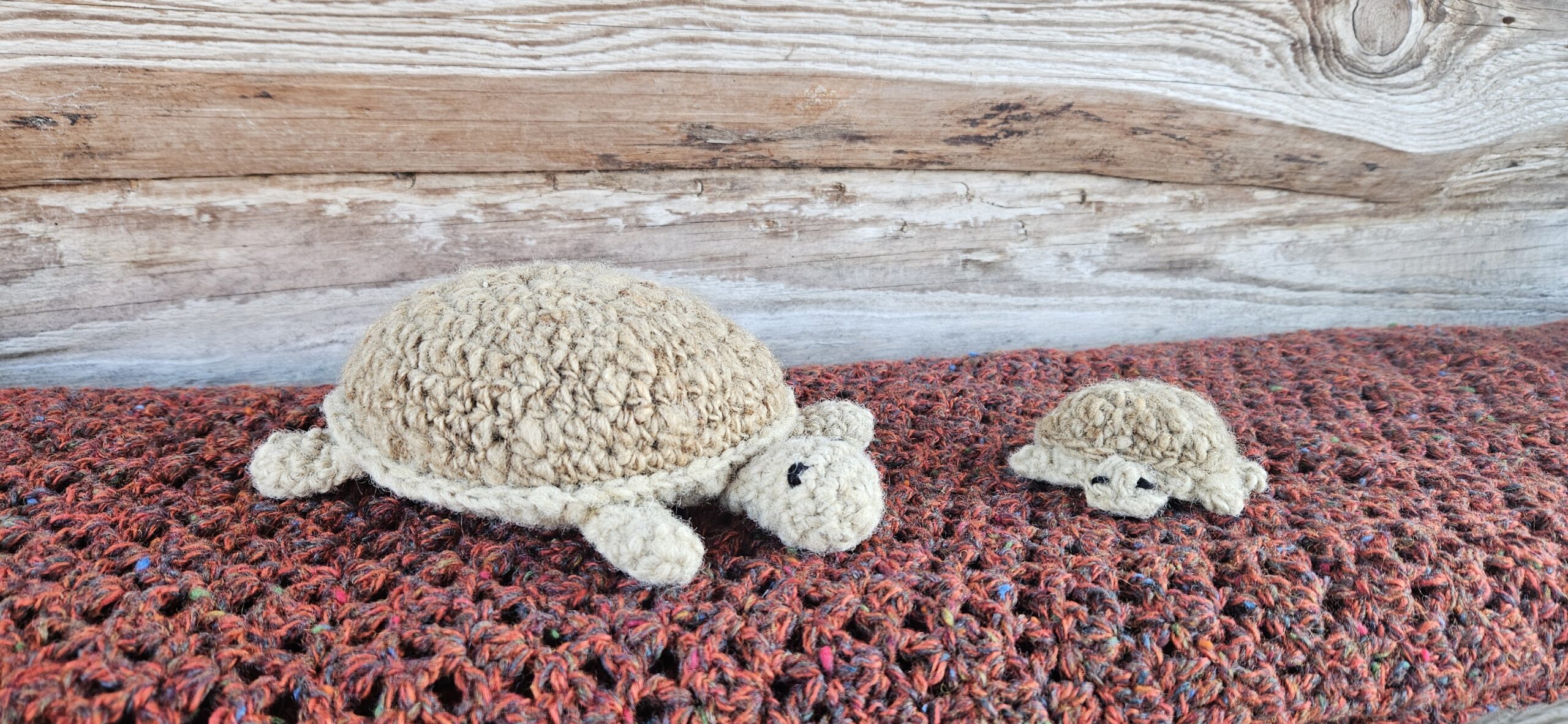 Een set van een grote en een kleine schildpad, gehaakt van de wol van het Drents Heideschaap.
