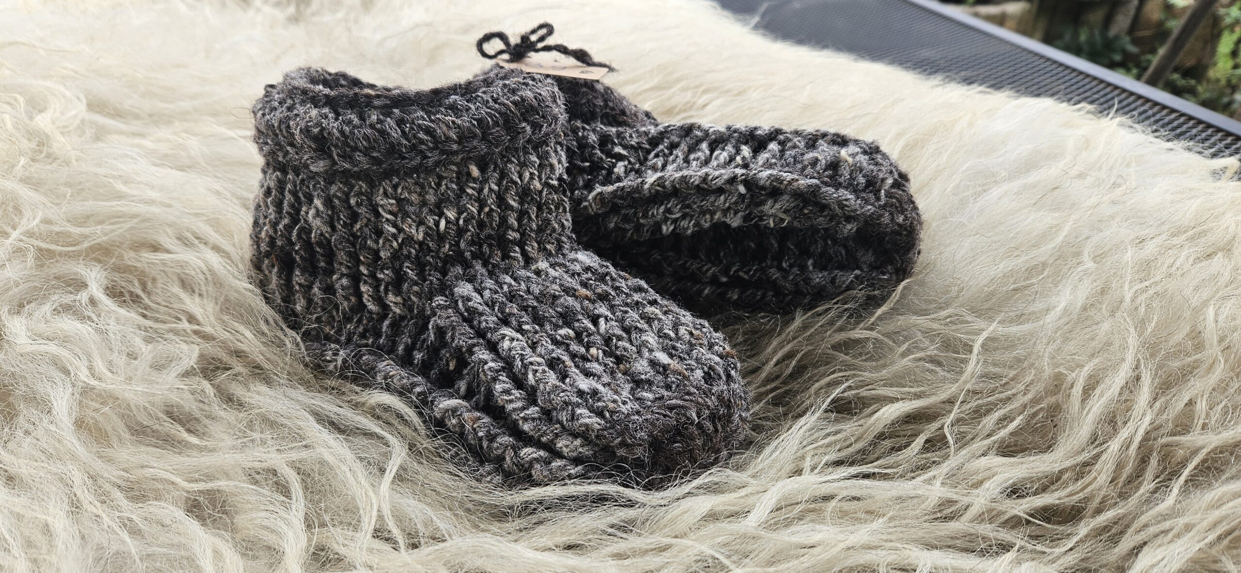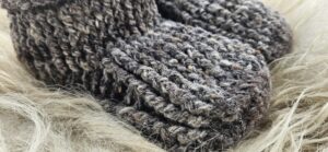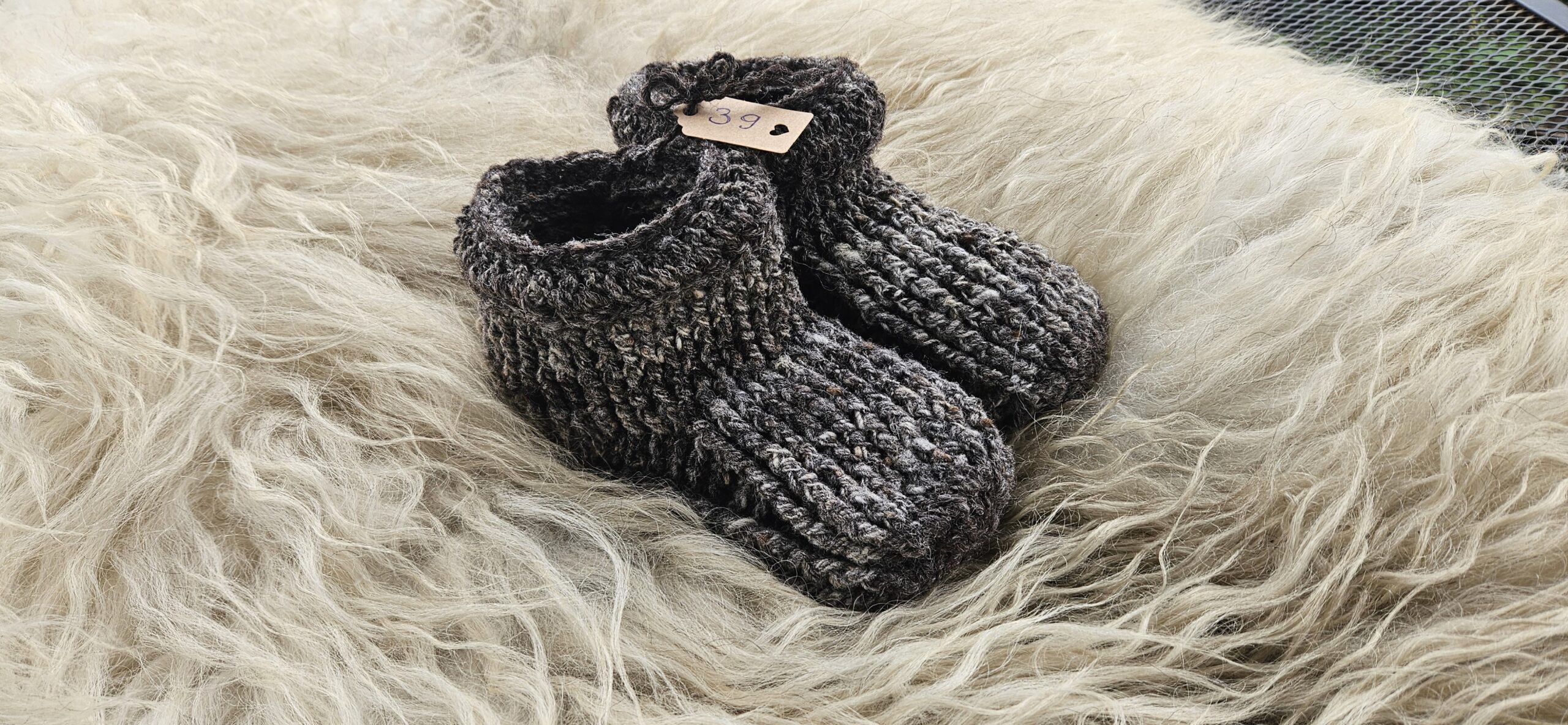 Wollen sloffen, gehaakt van handgesponnen wol van het bonte schaap. Maat 39.