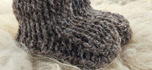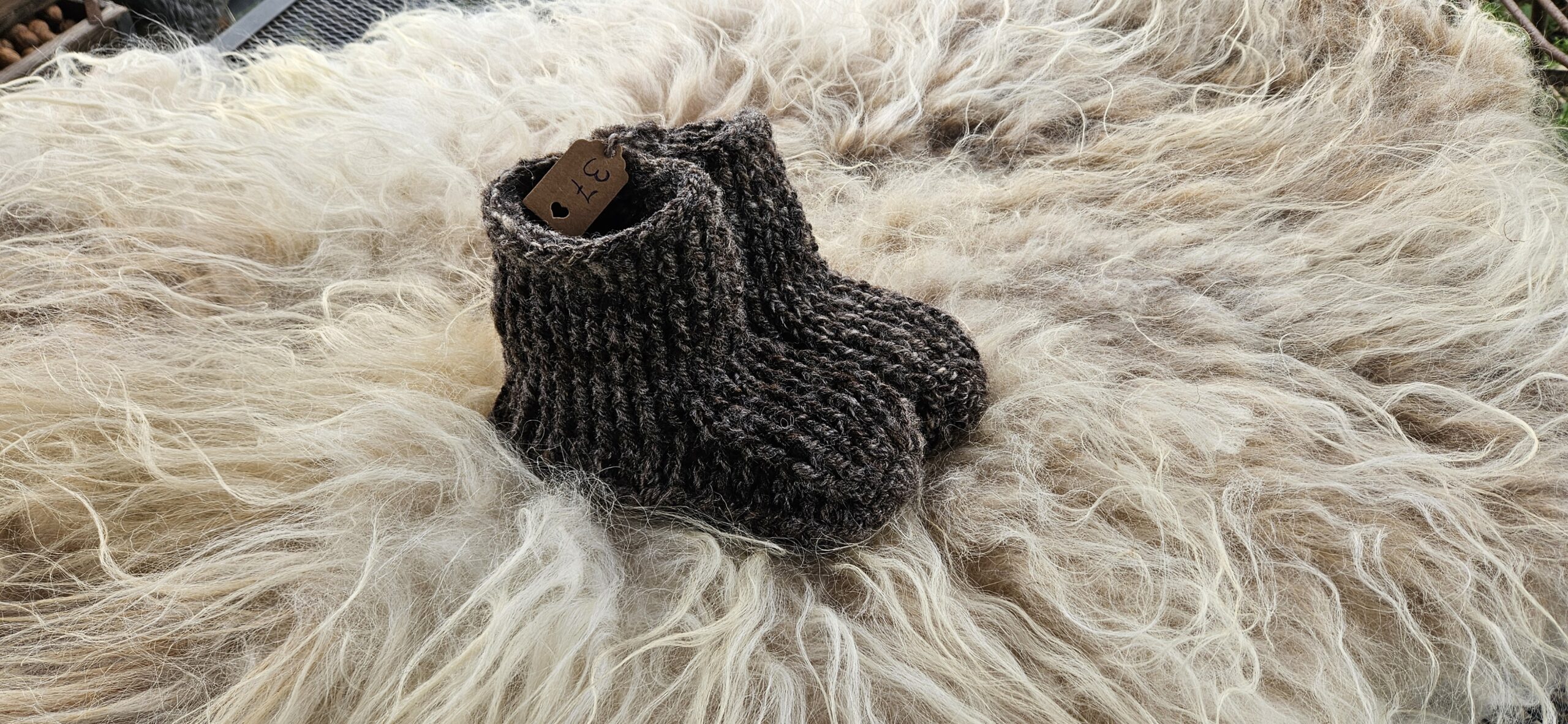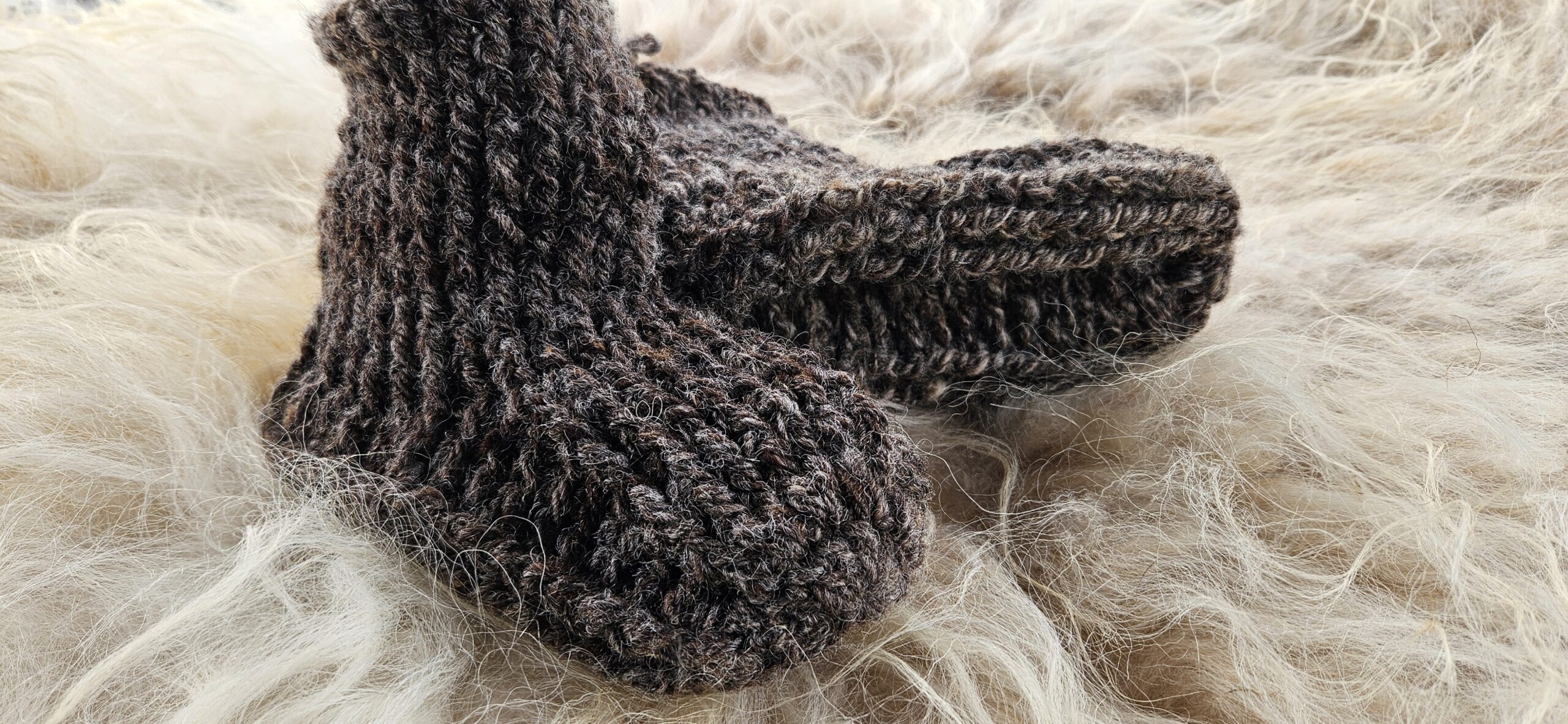 Wollen sloffen, gehaakt van handgesponnen wol van het bonte schaap. Maat 37.
