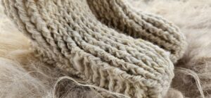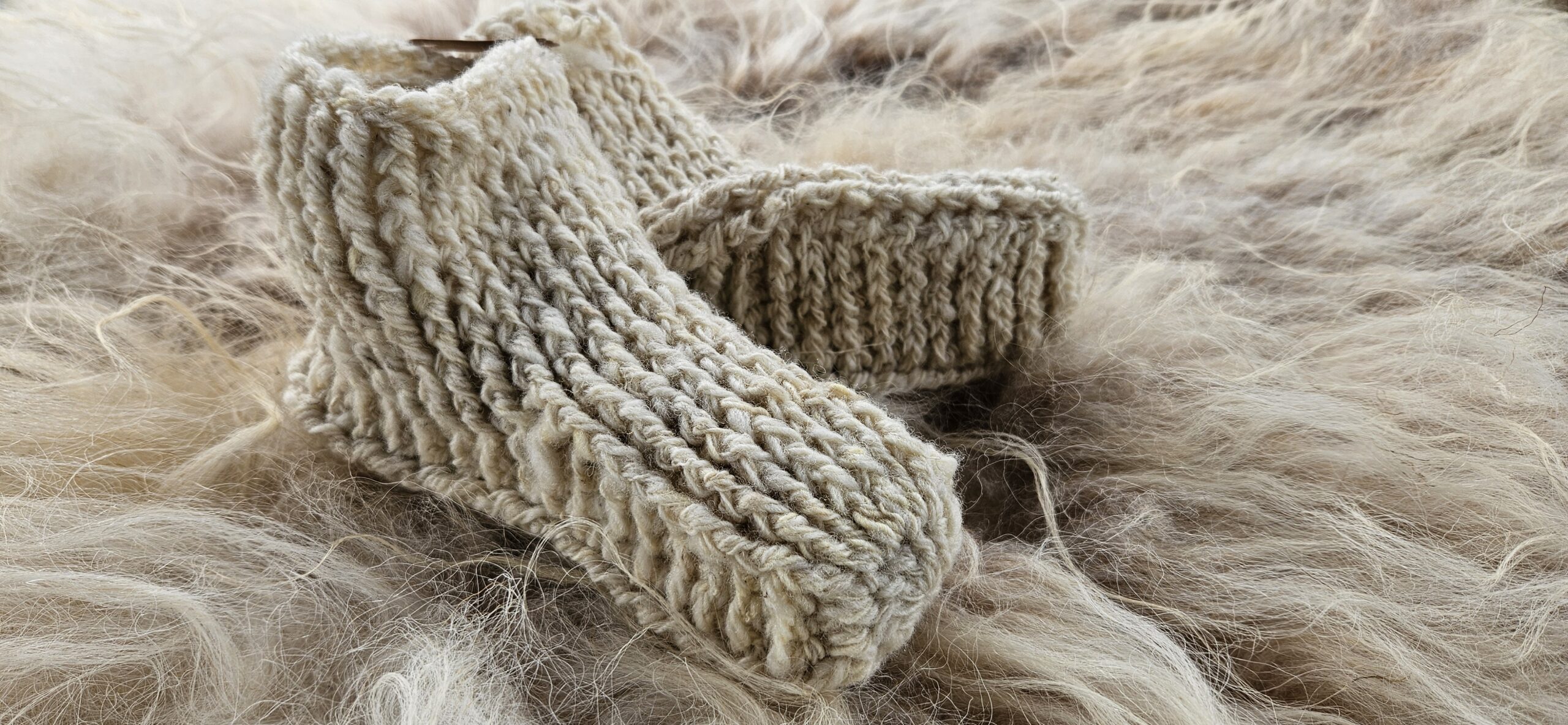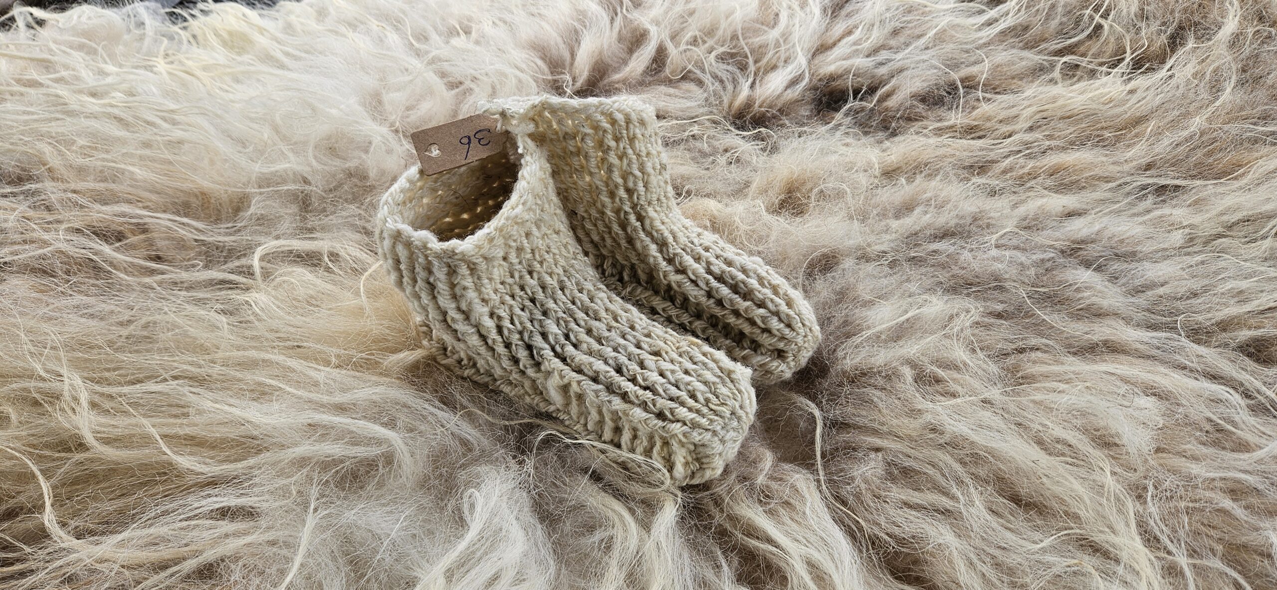 Wollen sloffen, gehaakt van handgesponnen schapenwol. Maat 36.