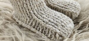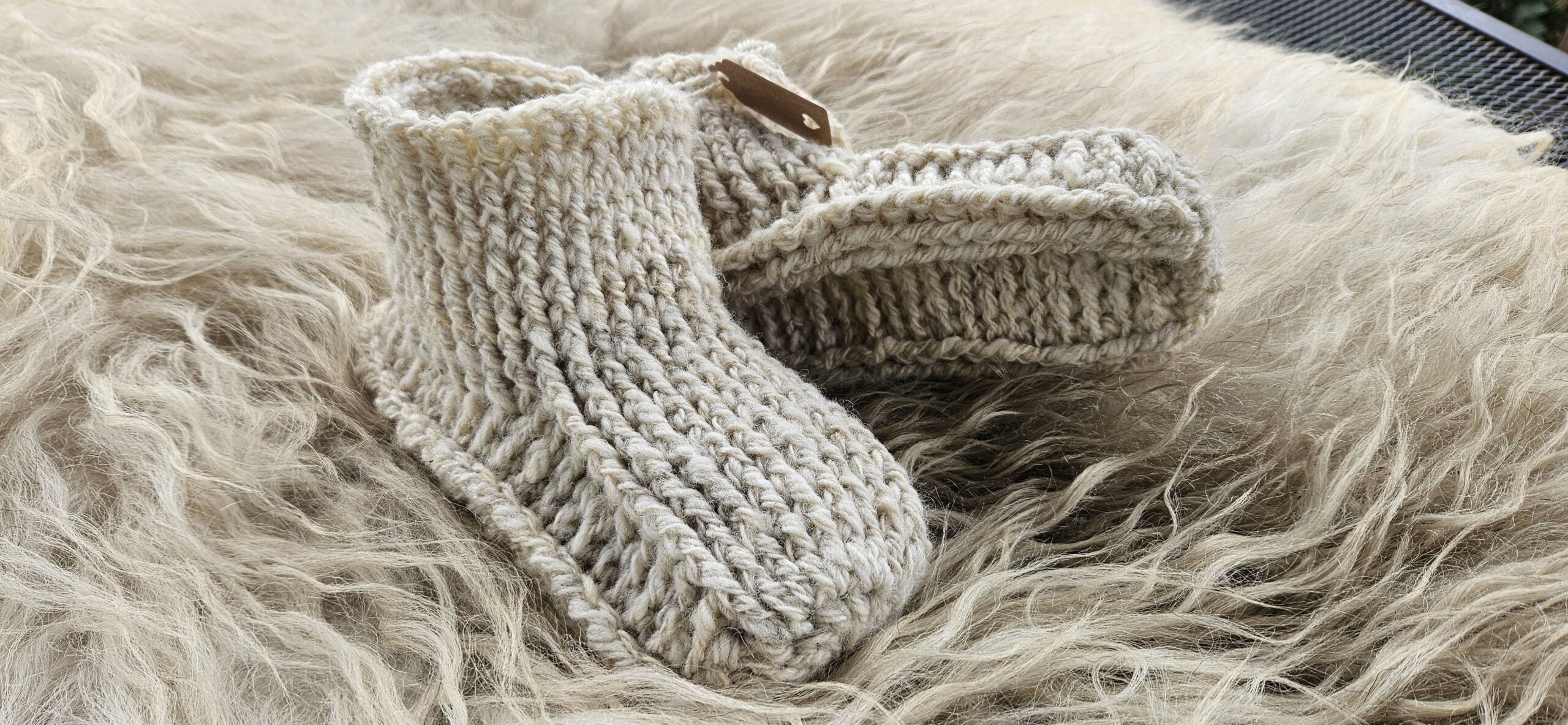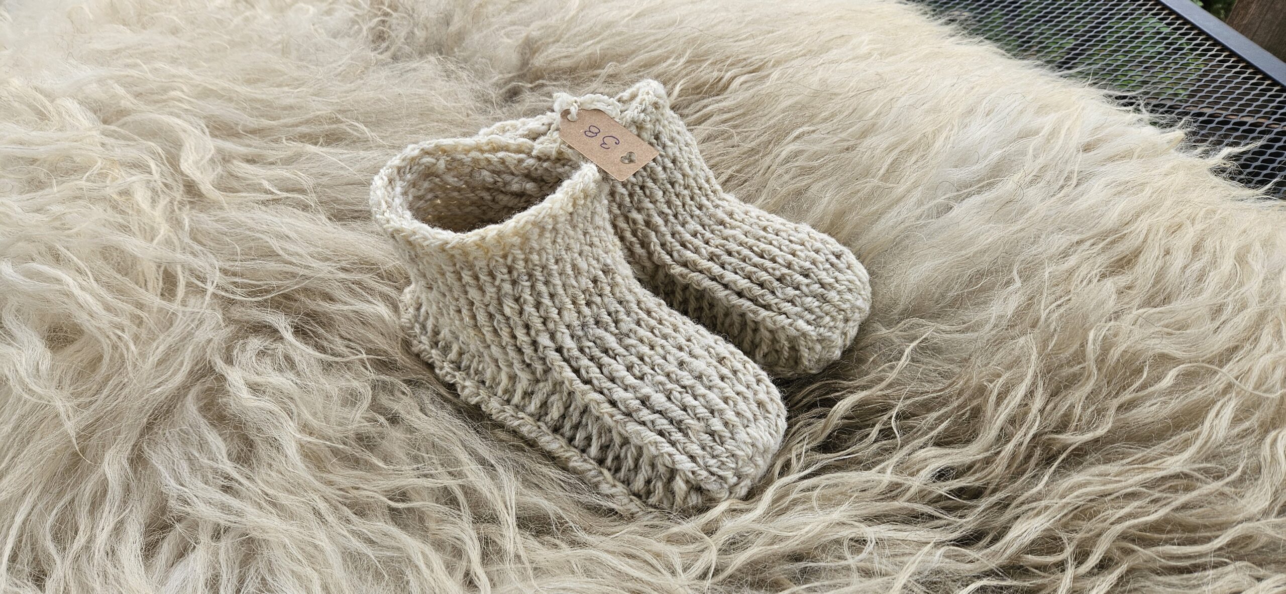 Wollen sloffen, gehaakt van handgesponnen wol van het Swifter schaap. Maat 38.