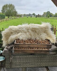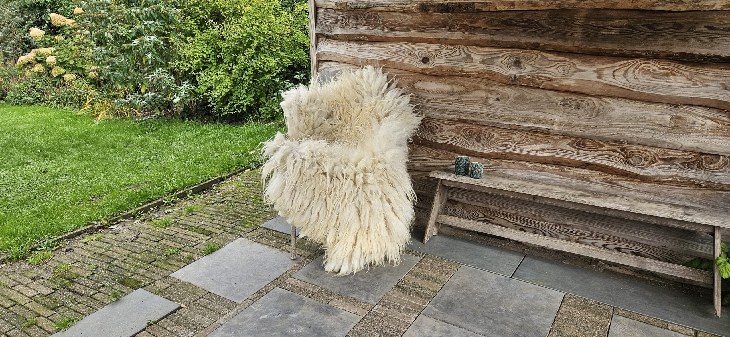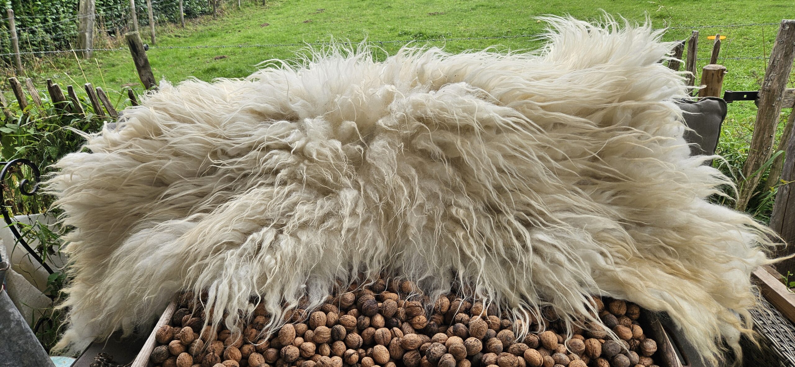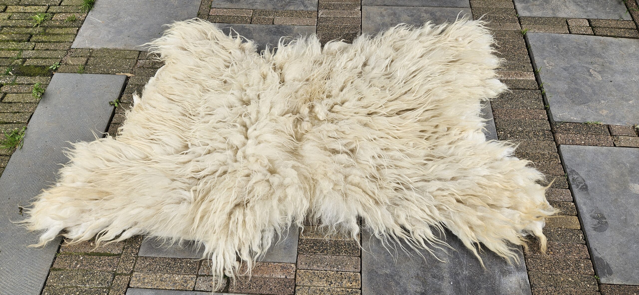 Een prachtige, zachte vacht van het Schoonebeeker schaap. Dit schaap woont op een kinderboerderij in Brabant. Is lekker geknuffeld, en geniet van een verblijf in hooi en stro. Ondanks dat ik al veel hooi en stro uit de vacht heb geplukt, zitten er diep in de vacht nog wel wat kleine stukjes hooi. Niet hinderlijk in gebruik, en zo op het oog is het nauwelijks te zien, maar wil het wel even gemeld hebben:)