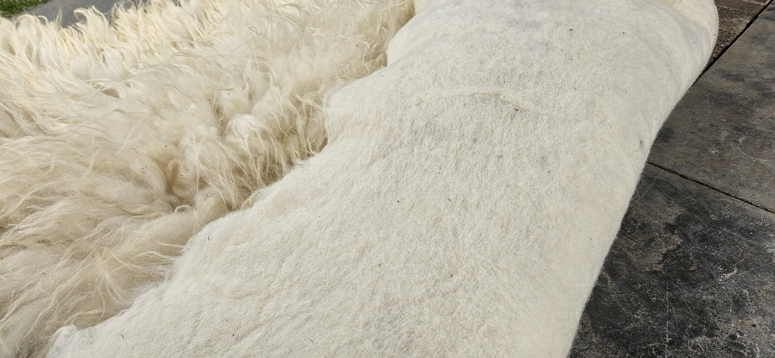 De geschoren schapenvacht is door middel van handwerk op gekaarde wol gevilt, 100% diervriendelijk en duurzaam! Leervrij.
